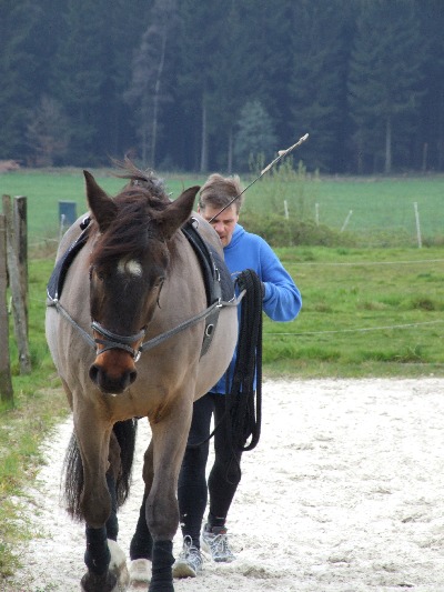 In der Übergangszeit und der akuten Behandlungszeit haben wir unseren Webster nach der herkömmlichen Methode longiert, um ihm die notwendige Bewegung zu verschaffen.